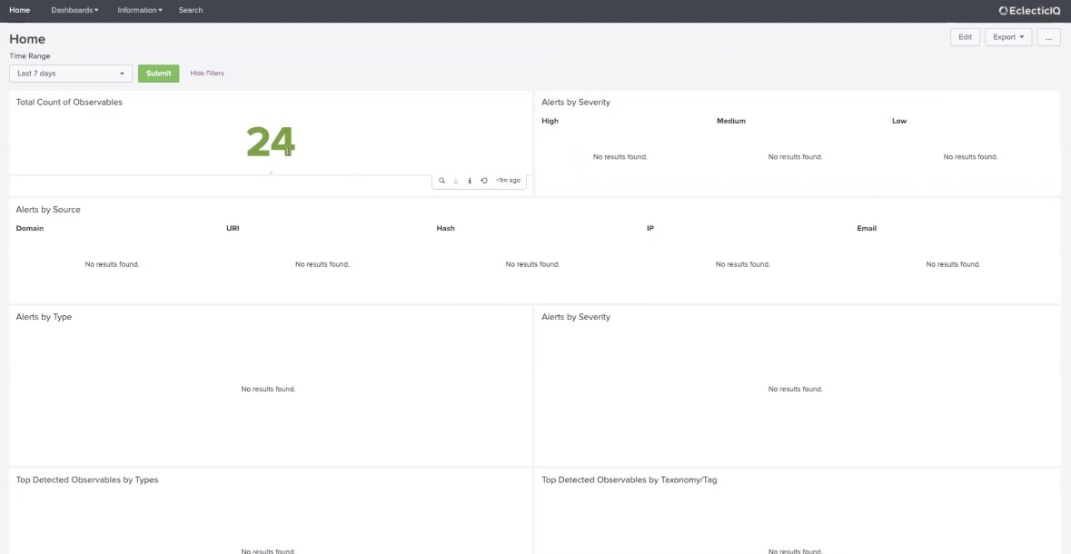 Example of Threat Intelligence EclecticIQ Platform App Home dashboard: