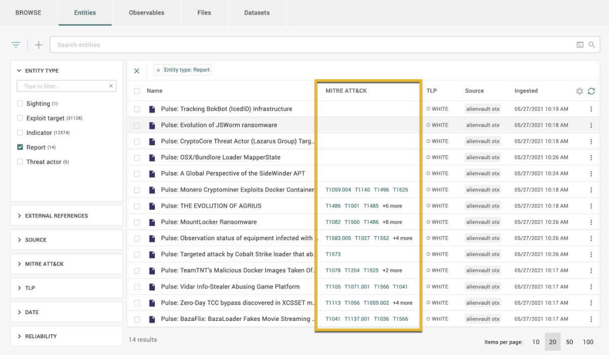 If the MITRE ATT&CK column is not visible, you can set EclecticIQ Intelligence Center to display it: