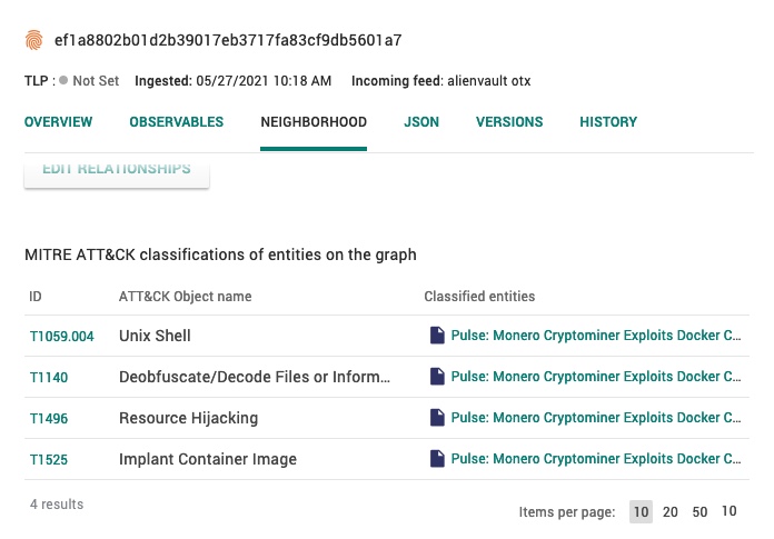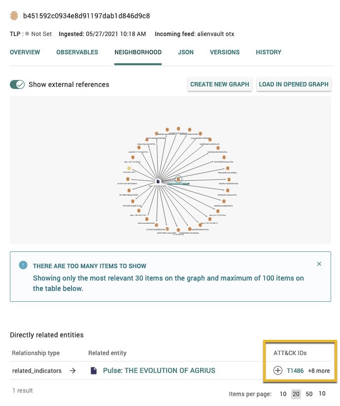 You can also see the ATT&CK classifications assigned to a related entity in the NEIGHBORHOOD tab when viewing entities and observables.