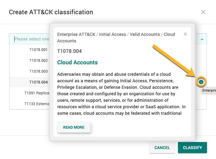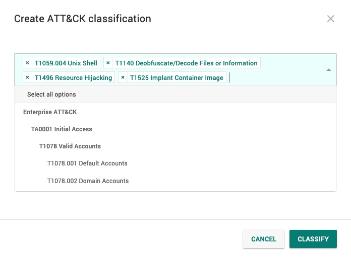 In the Create ATT&CK classification modal that appears, select the drop-down menu.